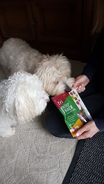 Als de verpakking leeg is, strooien we de kruimels die nog in de zak zitten gewoon over het gewone voer, zodat de honden kunnen genieten van een lekkere topping.